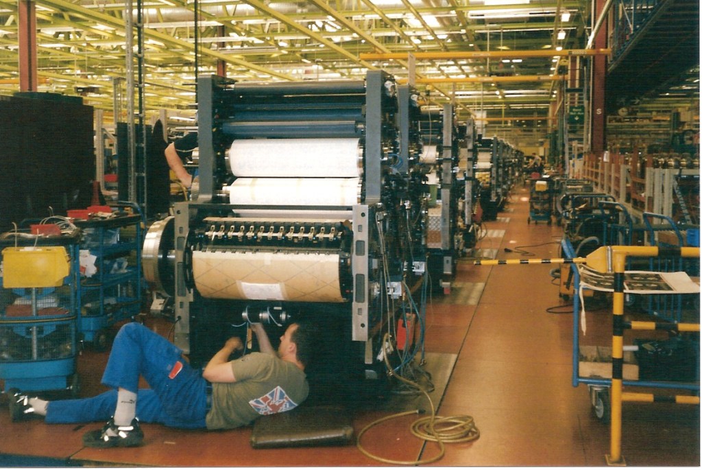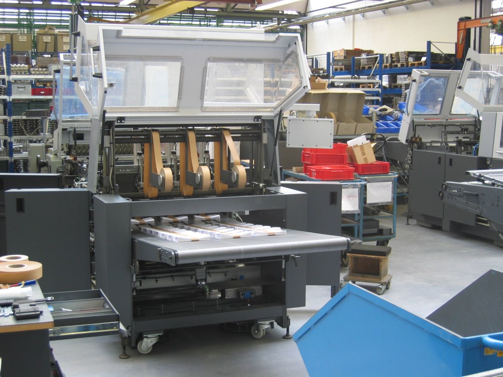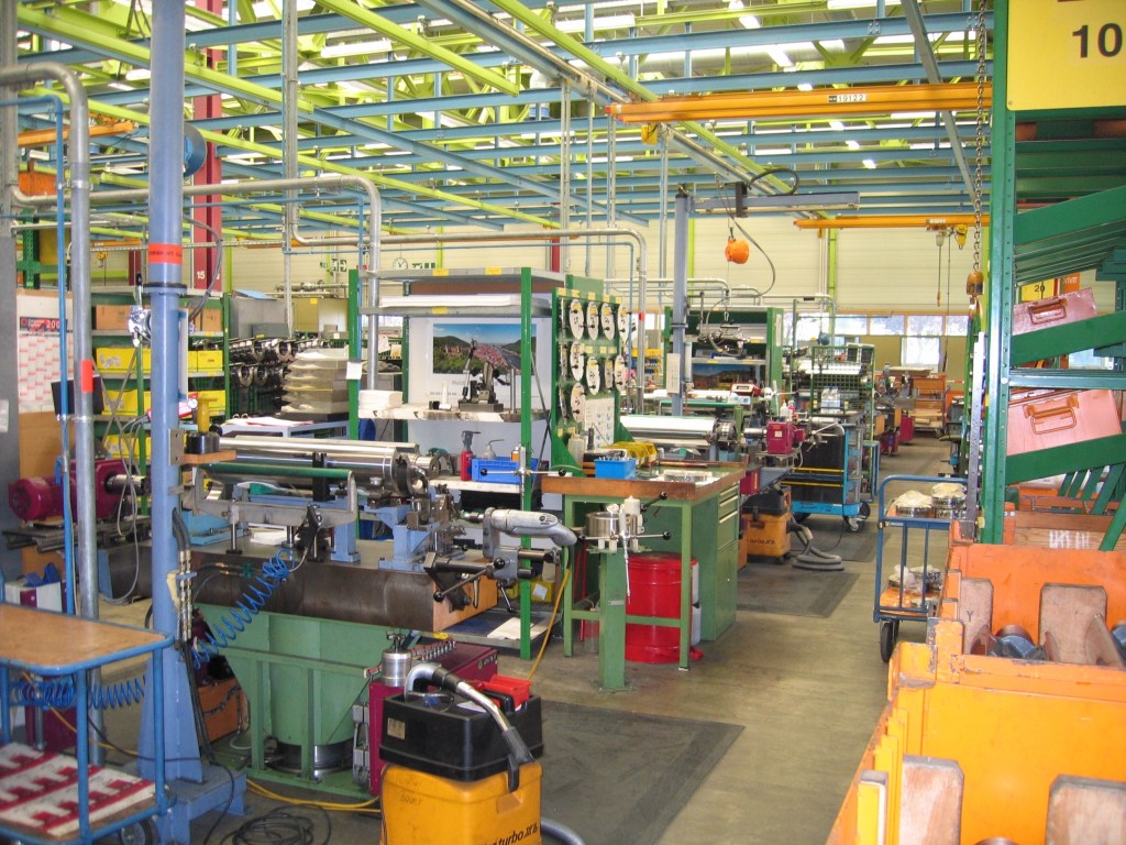 B- Hallissa on varaosavarasto. Tehtaan varaosakeskuksessa on 13 000 varaosaa palvelemassa maailmanlaajuista varaosatarvetta. Vanhempiin painokoneisiin tehdään tilauksesta konepajassa tarvittavat varaosat. Varaosakeskuksen varasto on automatisoitu, jotta varaosa voidaan toimittaa vuorokauden sisällä sitä tarvitsevalle asiakkaalle. Varaosakeskuksessa tapahtuu noin 4 000 lähetystä päivittäin eri puolille maailmaa. Painokoneiden mukana seuraa varaosakirja, jossa olevien painokone- ja varaosanumeroiden mukaan tilaus toimitetaan perille.Halli 10:ssä on kokoonpanohalli, jossa kootaan ensin painoyksikkö ja valmis painokone kootaan myöhemmin tilauksen mukaan yksiköistä. Painokoneiden sylinterit tulevat Amstettenistä, joihin kasataan naukkarit ym. tarvittava käsityönä. Kaikissa kokoonpanohalliin toimitetuissa osissa on koodi kenen tilaamaan painokoneeseen ne kuuluvat. Painokonerunkoon kiinnitetään ensin toiselle runkolevylle sylinterit ja runkopalkit sen ollessa kyljellään lattialla ja laittamalla sitten toinen runkolevy sitten niiden päälle. Painokoneen rislantelat saadaan aikaan, kun telaputkeen liitetään akseli kitkahitsauksella ja päälle sulatetaan muovi, joka hiotaan lopuksi. Kaikki painokoneet koepainetaan ennen toimitusta asiakkaalle.