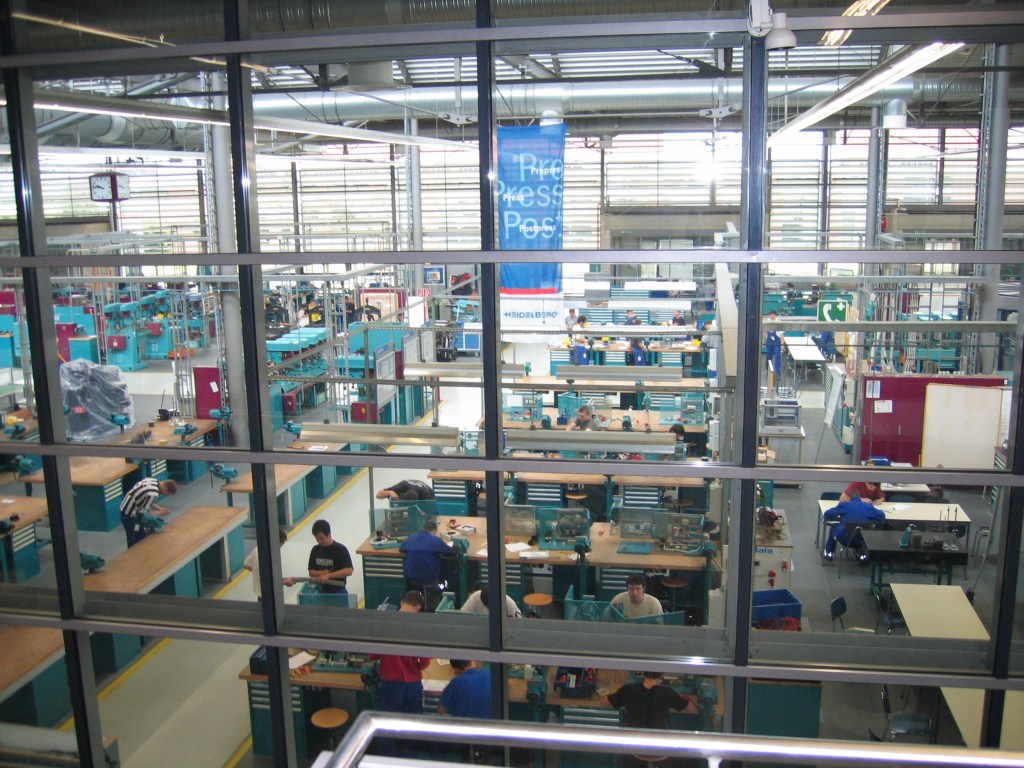 Pistäydyimme tehtaan tulevien työntekijöiden ammattikoulussa, jossa opiskellaan tekemään painokoneen osia. Menossa oli vanhojen käytöstä poistettujen painokoneiden entisöintiä museoihin jne.